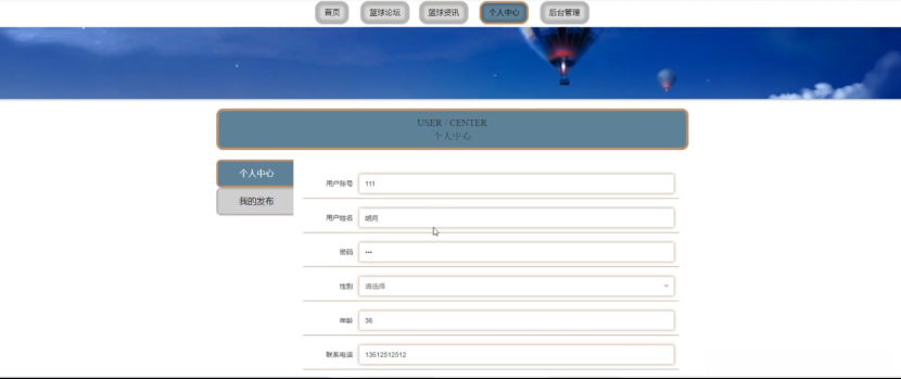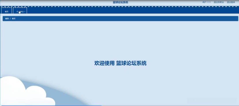 用户登录进入篮球论坛系统可以对首页、个人中心等进行相应操作,如图所示。