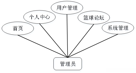 (a) 管理员;管理员使用本系统涉到的功能主要有:首页、个人中心、用户管理、篮球论坛、系统管理等功能。管理员用例图如图所示。