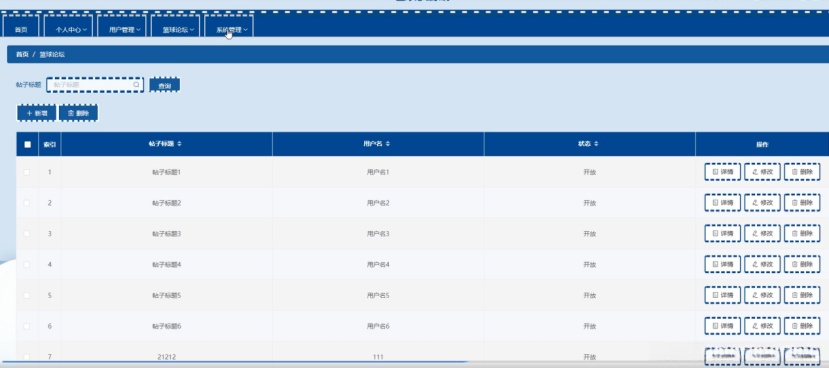 篮球论坛,在教师管理页面可以对索引、帖子标题、用户名、状态等内容进行详情、修改或删除等操作,如图所示。