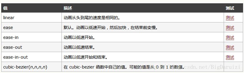 - animation-timing-function 指元素根据时间的推进来改变属性值的变换速率,是动画的播放方式;主要取值方式如图所示
