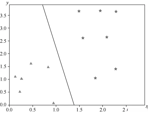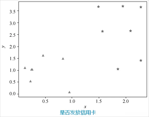 该行根据客户的信用评分来判断是否提供其信用卡此处假定横轴x表示客户的信用评分等级分数域范围从0到90分纵轴y则代表其工作稳定性在这些设定下绘制若干数据点用三角形标记表示该客户不符合条件无法获得卡片而用五角星标记表示符合条件能够申领到卡片如图所示