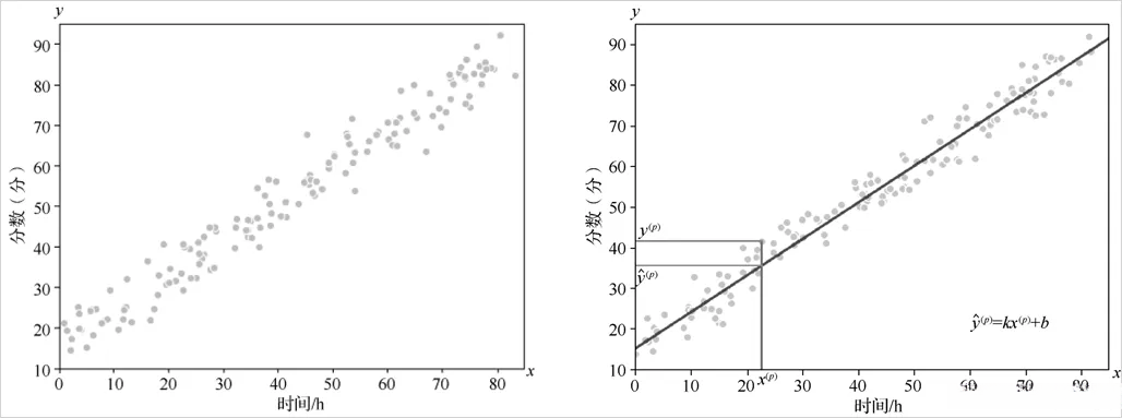 生成一些数据x和y分别表示时间投入和考试成绩,在寻找一条最佳拟合直线以使这条直线最佳地契合这些数据点时,在复习过程中时间和分数之间的关系通过图像表示(如图1所示)。