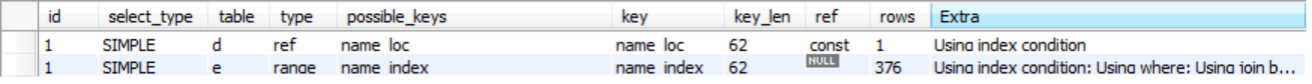 显示这一步所访问数据库中表名称(显示这一行的数据是关于哪张表的),有时不是真实的表名字,可能是简称,例如上面的e,d,也可能是第几步执行的结果的简称