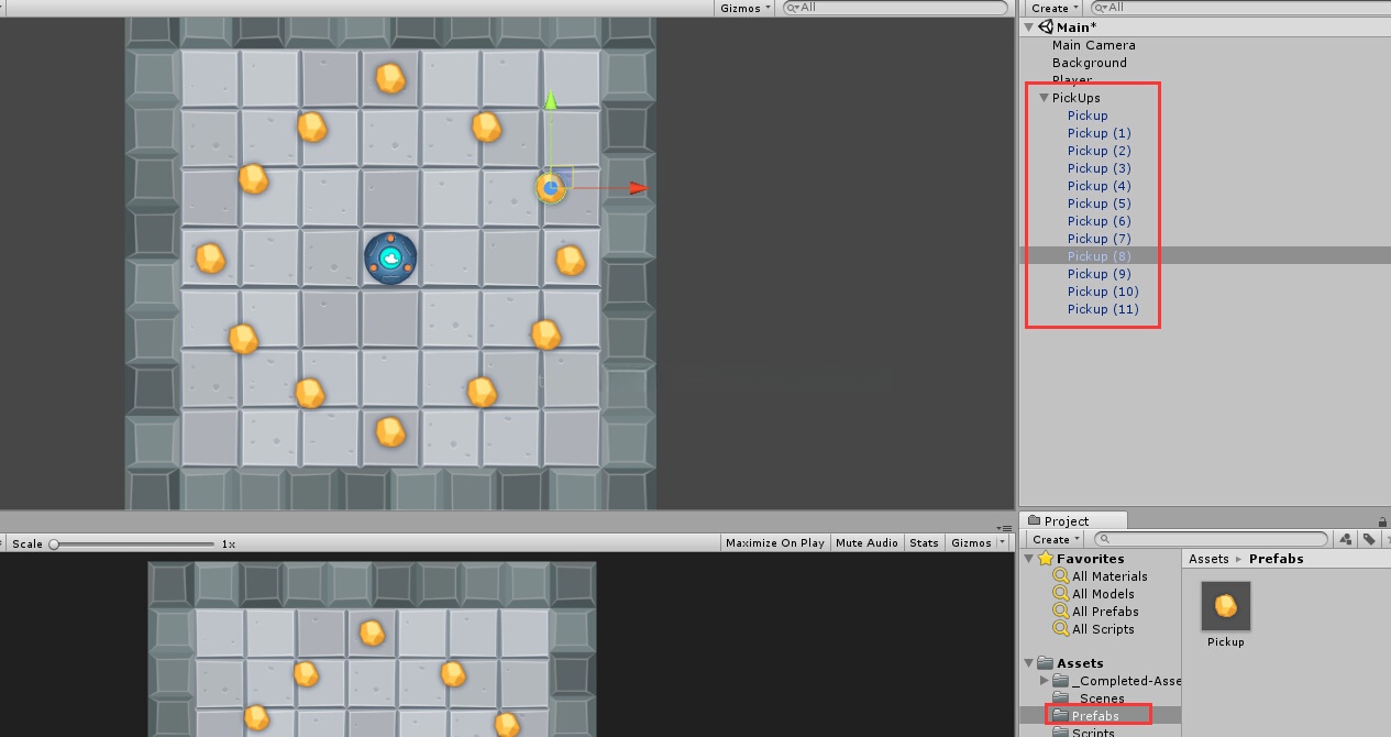 在Assets层级中新增一个文件夹命名为Prefabs,并将已配置好的PickUp导入其中以设置为预制件。在Hierarchy层级中新增一个对象命名为Pickups,并将现有的_pickup_导入其中使其成为子对象。随后选择该对象并按Ctrl+D复制操作将其复制11次排列成菱形形状。