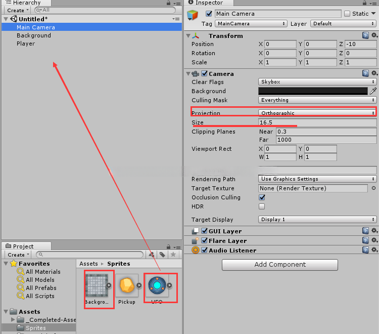 建立游戏运行的基础平面。在 Hierarchy 中导入 Sprites 文件夹中的 Background 精灵和 UFO 精灵,并重置它们的位置。将 Hierarchy 中的 UFO 替换为 Player 精灵。