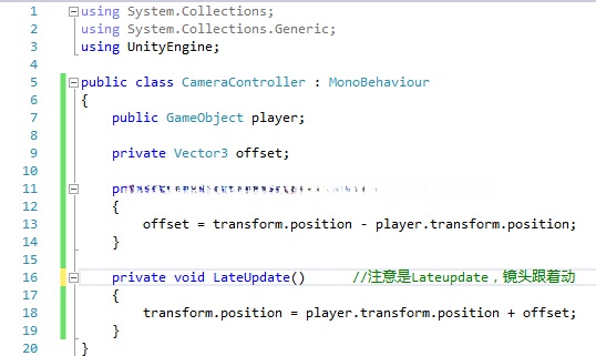 在使摄像机跟随UFO的过程中,首先想到的是将camera拖入player作为子对象。然而,在UFO旋转时镜头也会随之转动。因此需要新建CameraController脚本文件,并将Main Camera拖入其中进行编辑。
