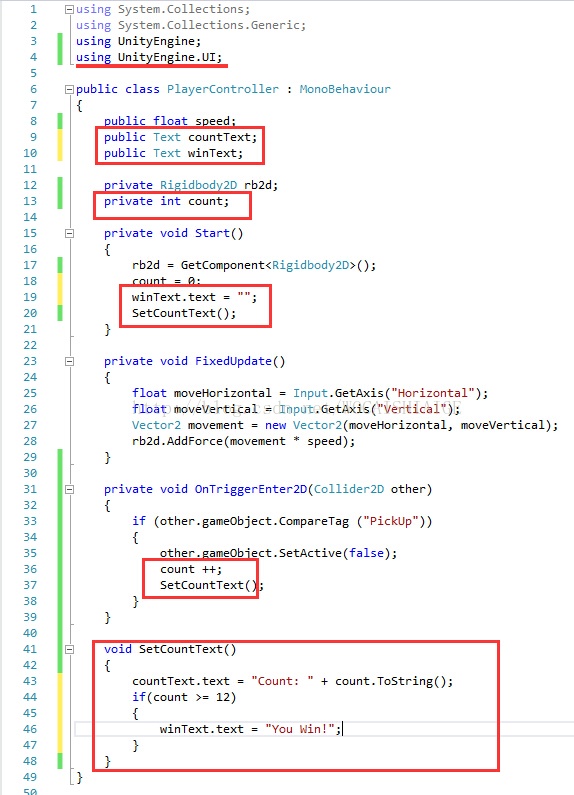 创建Text对象命名为CountText,并将其内容字段更改为'Count Text'。设置颜色属性为黄色,并将Anchor Preset属性值设定在左上角(通过Shift+Alt键指定)。将位置属性的坐标设置在(10,-10,0)。在Canvas对象下方新增一个Text对象,并将其命名为Win Text,并将其内容字段更改为Win Text;然后设置其Y坐标的值定位在75处并居中显示;最后将字体大小设置在24点;最后打开PlayerController脚本编辑窗口进行配置