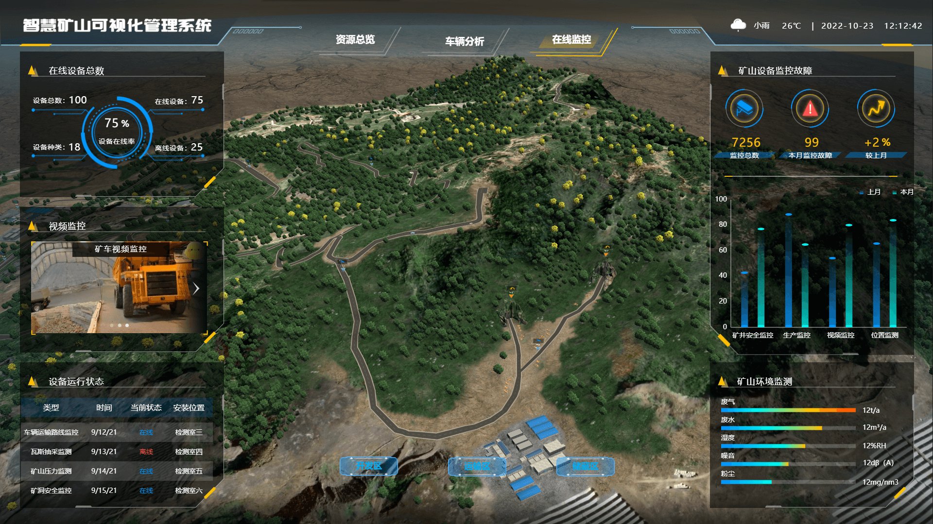 在线监控展示了监控设备状态以及矿山设备状态,能够实时展示各个区域的监控视频,并且能够对矿山环境进行监测。
