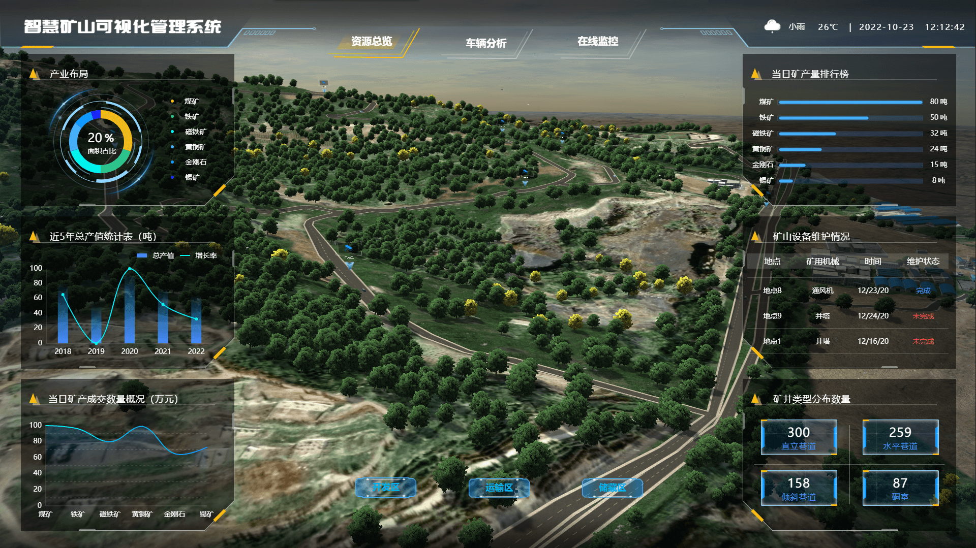 资源总览展示了矿山的整体情况,包括矿山产业相关情况、设备维护情况、矿井类型分布数量等。