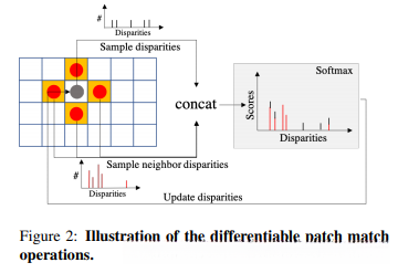Deep Stereo Matching: 为了进一步处理更复杂的现实世界场景,尤其是无纹理的区域或反射表面,现代方法利用CNN提取健壮特征[22]并进行匹配[40,41]。尽管这些技术已在基准测试中证明了出色的性能[11],但仍需要耗时的后处理。考虑到这一点,研究人员建议直接从给定的立体图像中回归亚像素视差[35、9、29]。通过将完整的传统立体声流水线实现为神经网络层,可以以端到端的方式训练这些模型,并能够在GPU上完全进行推理,从而大大提高了效率。不幸的是,由于成本和聚合的巨大规模,内存消耗和所需的计算仍然非常高,使得模型不切实际[15,8]。在本文中,我们的工作基于[15,8]。我们没有搜索完整的视差空间,而是利用新颖的可区分版本Patch Match来学习删减不太可能的匹配项并降低搜索空间的复杂性。我们的模型能够实时运行,同时保持可比的性能。