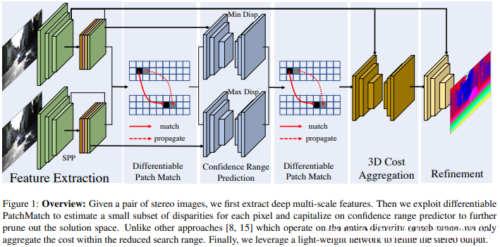 现代立体方法通常会在整个视差空间(8,15,9,29)上计算出对应的成本值。较大的搜索空间不仅会导致内存消耗增加、计算负担加重;而且还可能导致实时处理功能失效的情况出现。例如,在PSM-Net算法中[8]所指出的那样:构建并汇总3D成本量所需的时间已经超过250毫秒;这两个操作本身使得基于实时应用的处理变得不可行。为了在本文中解决这一问题:我们开发了一个高效的基于PatchMatch技术设计出来的修剪器模块;该模块能够预判每个像素点的信任度范围;从而能够构建出只需要较少操作即可完成的任务——稀疏成本量图景。这使得模型能够聚焦于高信任度区域;从而节省大量的计算资源与内存消耗等资源上的开支;与传统意义上的PatchMatch算法不同的是:我们的模块具有可区分性特征;这使得整个端到端的学习训练过程得以实现而不受影响或受限于某些限制条件或其他干扰因素的存在或影响。(重要的是:正如我们所展示的实验结果所示:这种信任度范围指标同样具有很好的预测误差评估价值;因此在深度估计相关的下游应用中使用这种方法将会获得更好的性能表现效果)