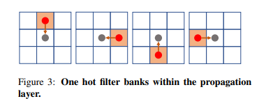 2. 传播层: 相邻像素的粒子经由预先设定的热核卷积操作传播(见图3),该过程编码了一个事实——即我们允许每个像素将粒子传递至其4邻域范围内的各个位置;