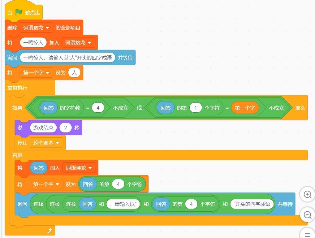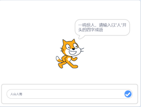 按下绿旗按钮后,在确认界面输入"一鸣惊人"后会触发对话框,并提示"一鸣惊人,请输出以"人"开头的四字成语"。