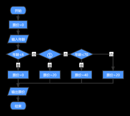 雷峰塔景区门票价格政策规定如下:成人需支付40元/人;6周岁及以下儿童可免费参观;6至18周岁之间青少年可购买半价票(20元/人);70岁及以上老年人凭相关证件可享受半价优惠。景区门票价格计算流程图如图所示,请判断图中标号①处的价格计算依据是什么?( )注:此处"≤"表示小于或等于