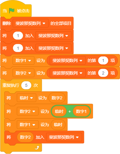 点击绿旗后,列表“斐波那契数列”中各项的内容依次是“1 1 2 3 5 8 13”。