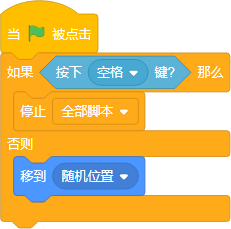 C、一直按着空格键,再点击绿旗,角色移到随机位置后,程序停止。