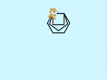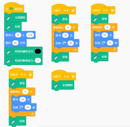 请在电子设备键盘上按下数字键5,并绘制图中所示的五边形图形。(4分)其中若右转动作被判定为左转,则将扣除2分;若绘制过程超出舞台区域,则扣除1分