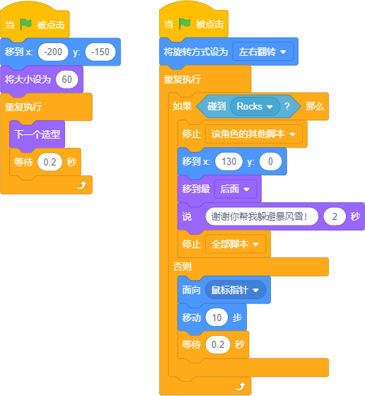 当小企鹅处于移动状态时,在遇到石头角色的情况下,则会停止造型切换动作,并将被引导至坐标(130,0)处进行位置调整。随后会说"感谢你的帮助!"这一指令两秒后执行完毕后,在等待期间藏身于石头之后。