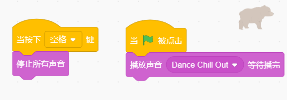 该程序由小猫与熊两个角色组成,并通过下图具体展示。启动绿色按钮后, 小猫与熊两个角色会共同播放音乐。请判断以下选项中哪一个是正确的?( )