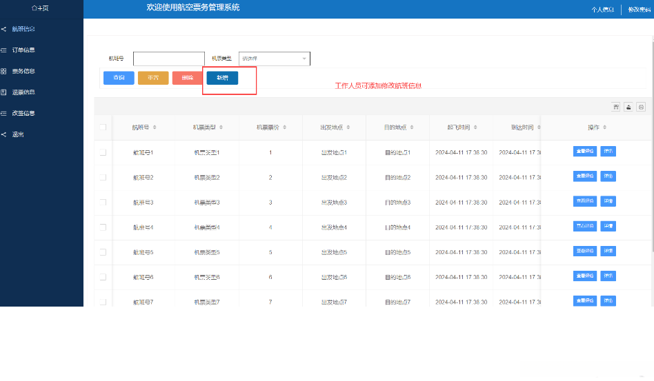 当工作人员点击“航班信息”按钮会显示出所有的航班信息,支持对航班信息的增删改查操作,界面如下图所示。