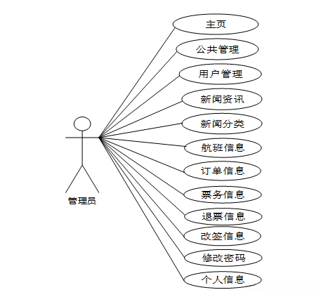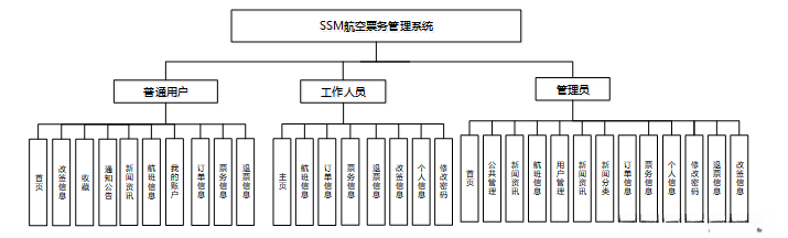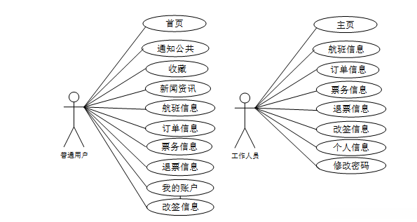按照航空票务管理系统的角色,划分为了普通用户模块、工作人员模块和管理员模块这三大部分。