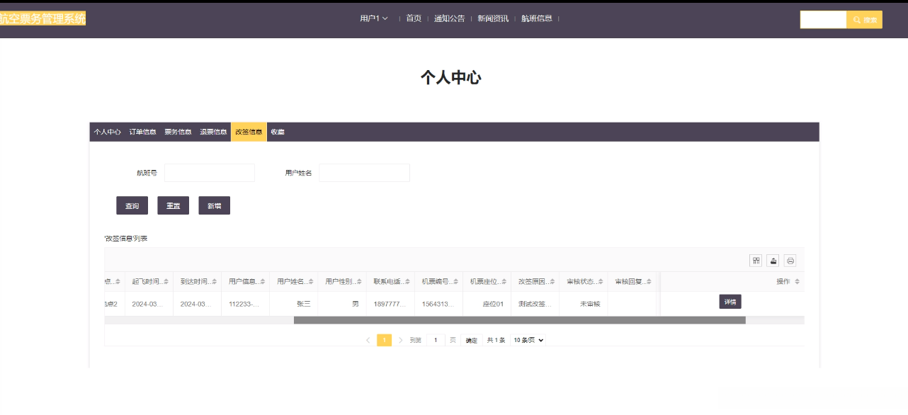 (3)改签信息:点击“改签信息”按钮会显示出所有的改签信息,支持对改签信息增删改查操作。