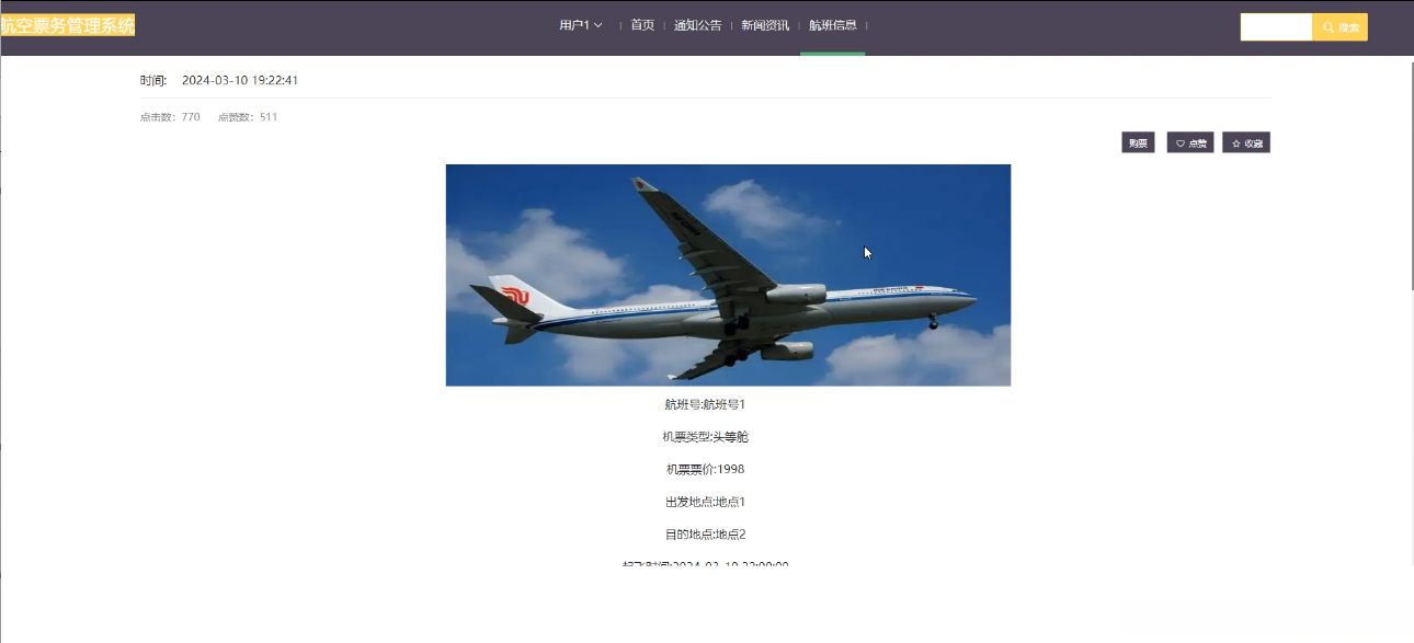 (4)航班信息:当用户点击“航班信息”这一菜单按钮,会显示管理员在后台发布的所有的航班信息,可以查看详情,进行购票、收藏、点赞、评论等;