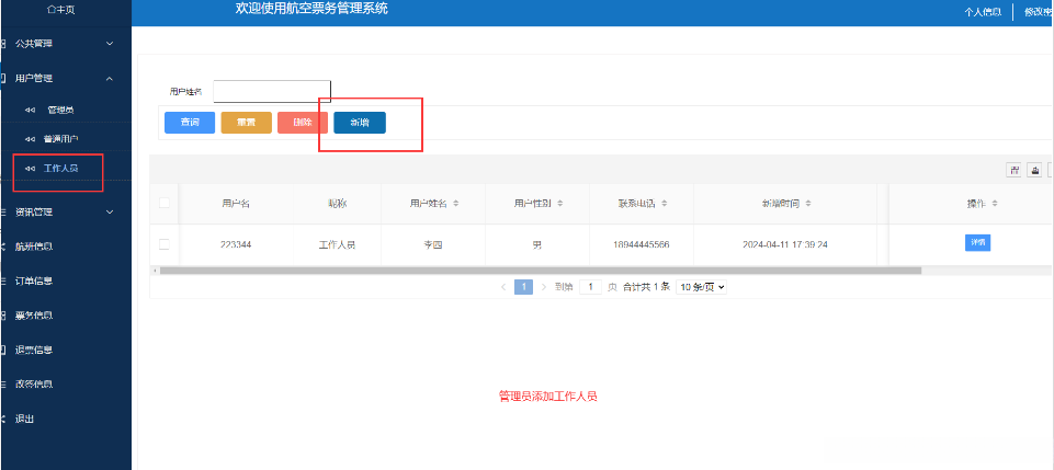 航空票务管理系统中的管理人员是可以对注册的普通用户、工作人员进行管理的,也可以对管理员进行管控。界面如下图4-7所示。