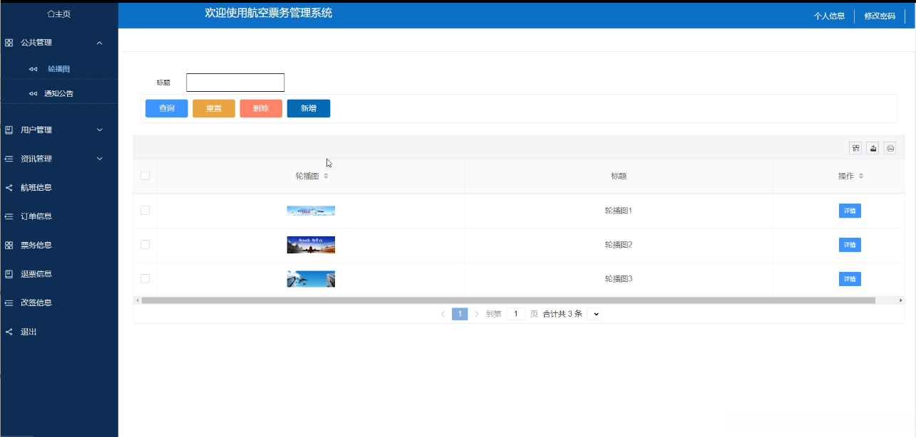 (2)公共管理:进入后台首页工具栏点击“公共管理”这个按钮可以查看所有轮播图、退票信息等信息,可以进行详情查看、删除、查看评论等操作。