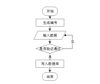 用户成功登入系统后就能够实现增加数据的操作,增加数据的编号由系统生成,用户不能随意填写,除了编号以外,其他增加信息用户自己填写,填写后的信息经过系统验证,验证通过后即可完成数据新增,数据新增的流程图如下图2-1所示。