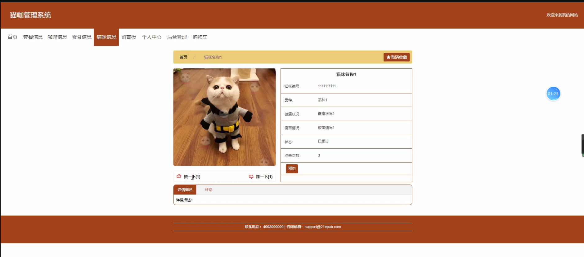 选题背景: 随着人们生活水平的提高和生活方式的多样化,宠物养殖业迅速发展起来。其中,猫咖作为一种结合了咖啡店和猫咪的特殊场所,逐渐受到人们的喜爱。猫咖不仅提供了一个休闲放松的环境,还能满足人们与猫咪互动的需求。然而,目前猫咖管理仍存在一些问题,如人员管理、卫生管理、猫咪健康监控等方面的挑战。因此,开发一套完善的猫咖管理系统具有重要的意义。