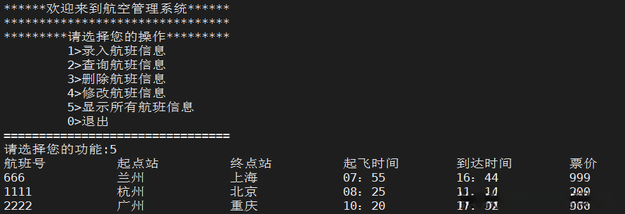 printf(" 5>显示所有航班信息 \n");