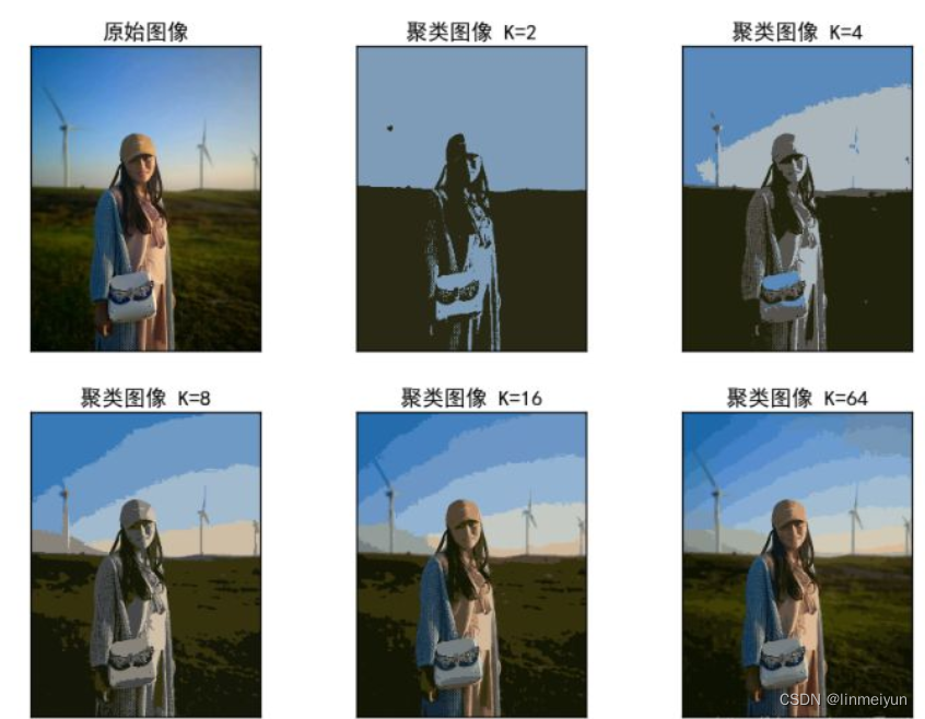输出结果如下图所示,当K=2颜色聚集成两种,当K=64颜色聚集成64种。