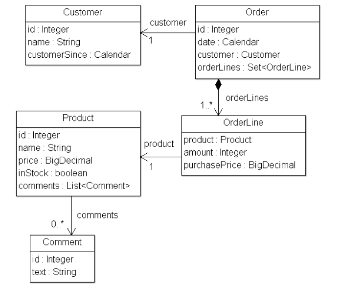 为此, 我们计划构建一个极为简洁的实体模型来代表我们的应用程序: 将Products(商品)与Orders(订单)关联起来, 并将此关系用于将Orders卖给Customers(客户). 此外, 我们还需维护Products的Comments以记录相关信息. 同时, 在此架构中, 我们也将维护Products的Comments以记录相关信息. 应用程序模型如下:
