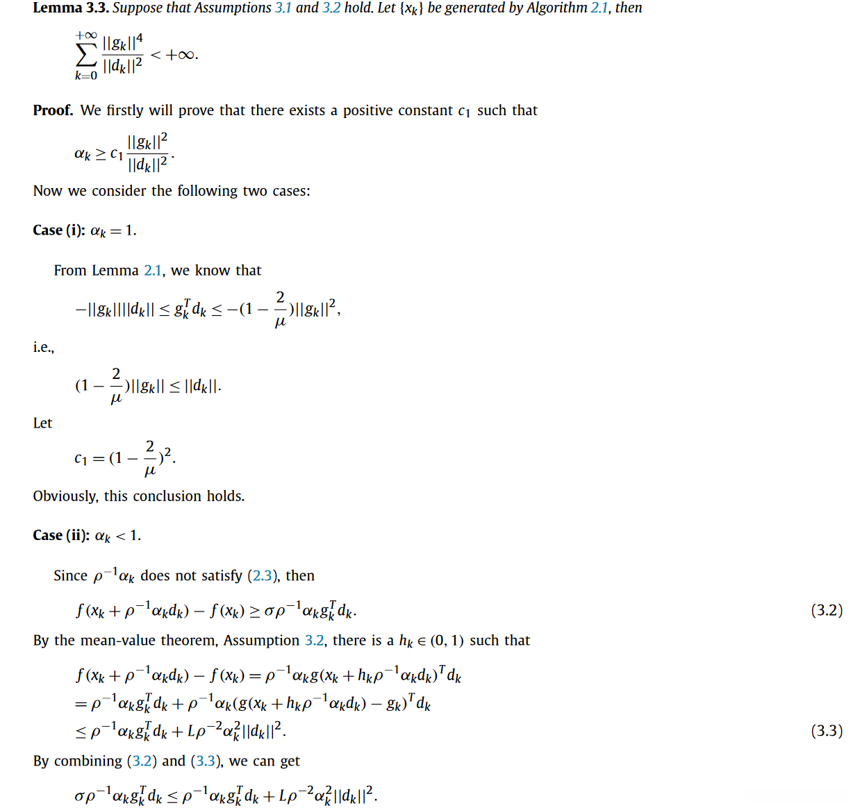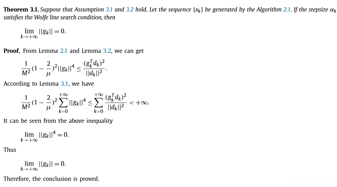 基于上述经典假设以及标准Wolfe线搜索准则(编号分别为2.1至2.2),我们首先着重证明了所提出的算法在满足Wolfe线搜索准则条件下的全局收敛性质。该引理具有显著的重要性,在评估所提出算法全局收敛性的过程中扮演了关键角色。它与文献[27]中的方法具有相似之处,在此省略详细论证过程