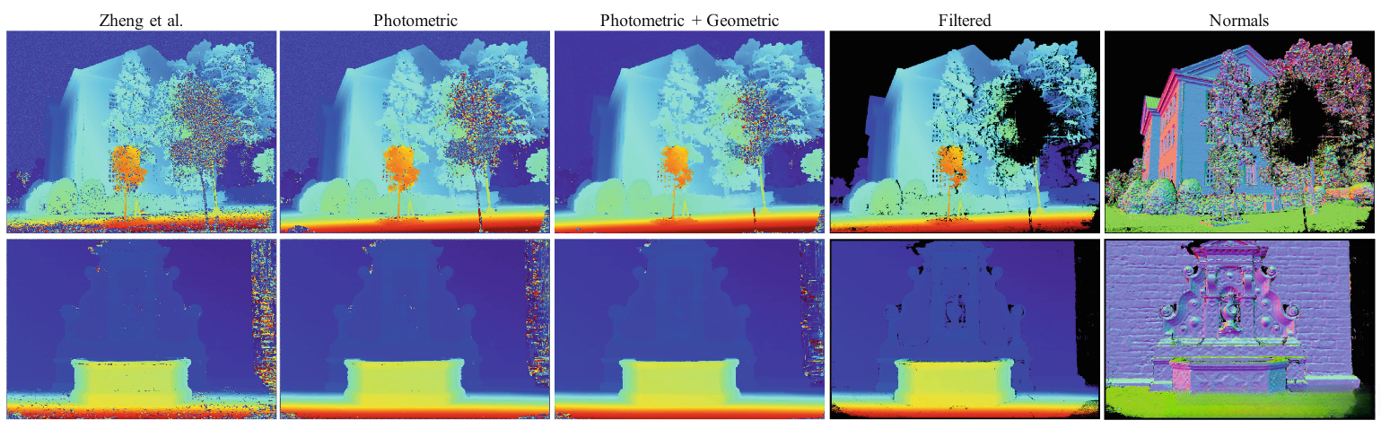 Our method estimates accurate depth and normal information using photometric and geometric information for pixelwise view selection and for image-based fusion and filtering.