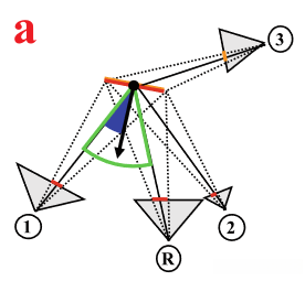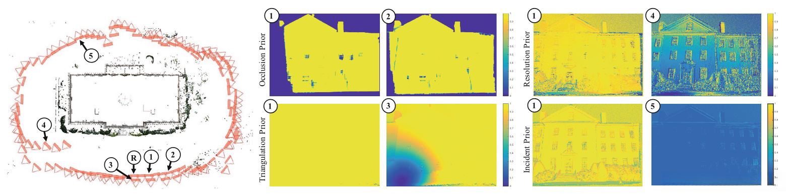 (a) Illustration of geometric priors for reference view (R) and three source views (1–3). View 1 has similar resolution (red), and good triangulation (green) and incident angle (blue), while view 2 is oblique and has lower resolution. View 3 cannot see the patch.