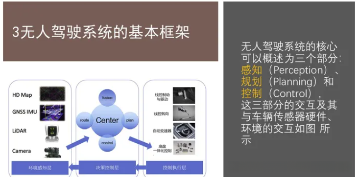 自动驾驶汽车关键技术 主要包括环境感知 、精准定位 、决策与规划 、控制与执行 、高精地图 与车联网V2X 以及自动驾驶汽车测试 与验证技术 等。