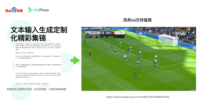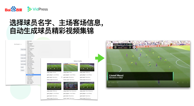 这一款功能是行业内领先的自定义足球精彩集锦生成工具。当用户输入特定球员并选择比赛时间后, 系统将自动完成该球员的精彩瞬间视频集锦制作, 并提供慢动作回放功能。目前该系统已成功部署于百度百科上的400多个足球运动员及球队页面上。