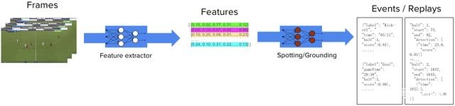 通过将足球比赛转播视频中的回放片段与原始事件进行匹配(replay grounding),我们可以实现对这些事件的详细追溯。通常会有多个回看镜头记录同一精彩瞬间,并且这些镜头之间可能相隔数十秒甚至上百秒的时间间隔;此外,在不同比赛中段落也可能采用不同的视角捕捉到这些镜头(replay);这种匹配关系实际上是对超长时间视频理解能力的一种重要评估方式。