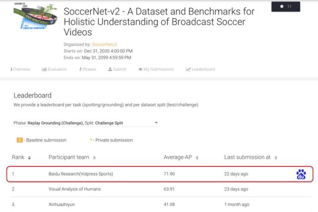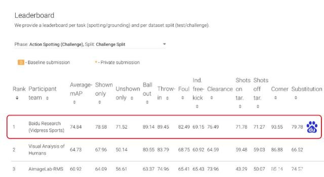 于最近召开的国际计算机视觉与模式识别顶级会议CVPR 2021上, 视频理解领域的最具声望的国际活动识别挑战赛(ActivityNet)工作坊下设多个子赛项均发布了排行榜。众多顶尖企业和研究机构包括百度集团等重量级企业以及清华大学等顶尖学府均参与了本次赛事。其中SoccerNet-v2挑战赛是首个专注于全面解析足球比赛视频的任务, 在这一赛事中, 在两项核心任务上百度研究院取得了压倒性胜利。