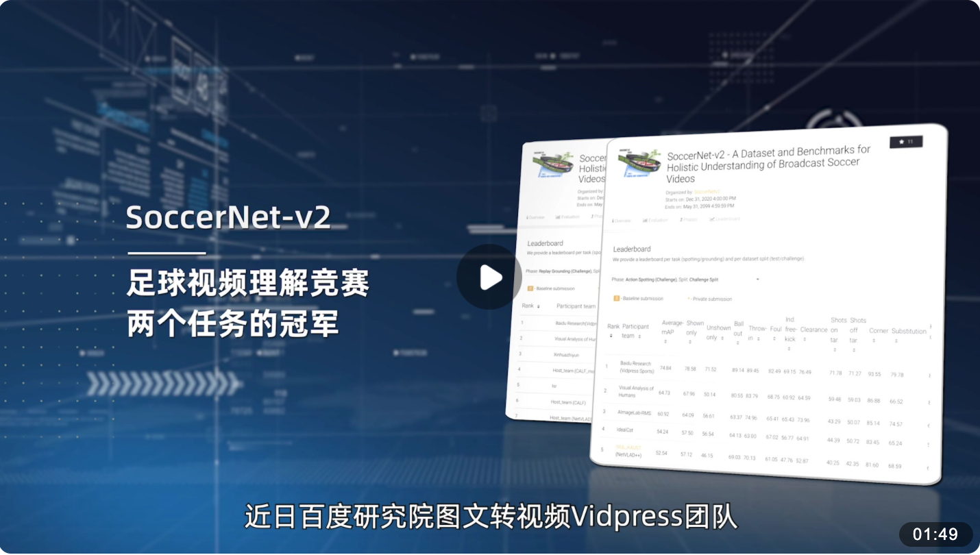 百度VidPress Sports团队获SoccerNet-v2足球视频理解竞赛双料冠军