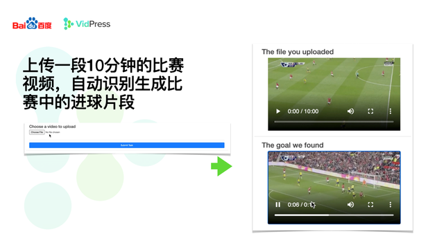 此外, 团队开发了一条基于图像场景识别技术的应用化智能生产流水线。该生产线能够快速解析并分析上传的长时长视频数据, 并根据检测结果识别出是否存在进Goal事件; 通过精确识别进Goal的时间点位置实现事件追踪; 进而实现自动剪辑处理过程。