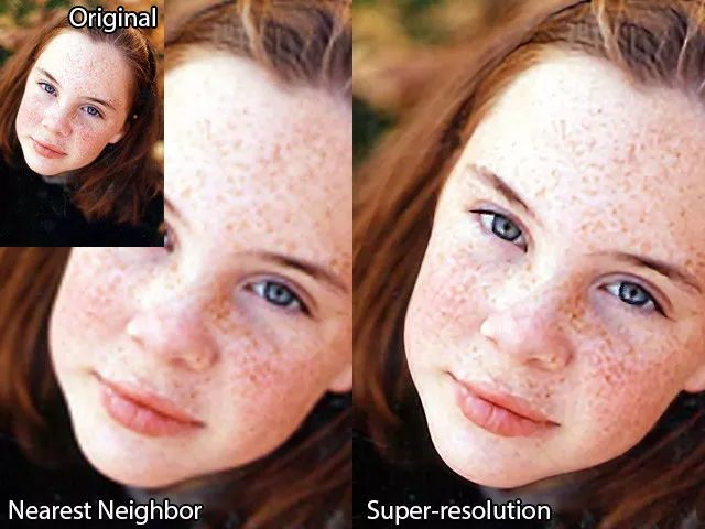 通过查看上文的图可以看到最近邻插值直接放大的图像与超分辨率算法生成的大图之间的对比研究。普通人都能明显感觉到后者更为舒适