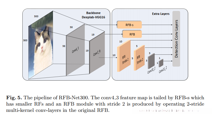 提出的网络使用 多尺度单阶段的SSD框架,嵌入并改善抽取的特征从轻量级框架更加高速和准确,由于RFB容易整合在CNN中,尽可能保留SSD框架,主要修改在于代替卷积层使用RFB,如图所示。