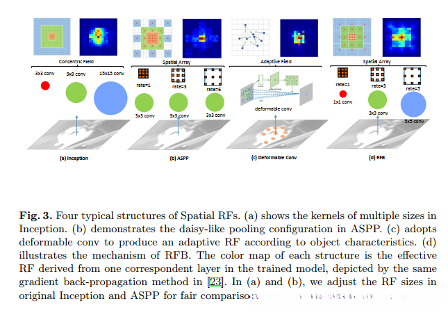 然而常规的深度学习方法,常常设置接受野相同的尺寸应用于特征图,其可能导致区别特征和鲁棒性的丢失。Inception网络考虑了接受野的多种尺寸,通过多分支结构使用不同的卷积核,其在两阶段检测取得竞争性的结果。然而卷积核的采样来源于同一中心。ASPP相似的想法提出,其探究多尺度信息,利用多个不同膨胀率实现特征图采样在不同距离的中心采样,展现在语义分割方法的高效性。但是这些特征来自相同卷积核的特征图,相比较于雏形 最终的特征缺少区别性。可变形卷积调整空间接受野通过尺寸和形状。虽然它的采样网格是灵活的,但偏心的影响RFs没有考虑到,一个射频中的所有像素输出响应和重要的信息未强调。