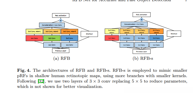 RFB 在多尺度图上:原始SSD 基础网络使用级联卷积层,在我的实现中,保持相同的级联,在RFB的版本中,使用单结构设置最初的离心率的影响。结构设置模拟偏心距的影响。的速度的大小和偏心脉冲重复频率不同的视觉地图,我们相应地调整RFB形成一个RFB-s模块的参数,模拟小型脉冲浅人类网膜代表地图,并把它在conv4-3功能,见图。图和无花果。过去几卷积层保存自特征图的分辨率太小过滤器适用于大型内核,如5 x 5。