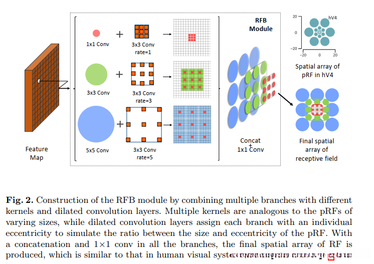 RFB 强调了接受野和偏心率之间的关系,通过较小的卷积核赋予中心位置的更大的权重。