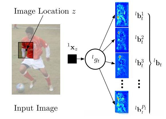 在图中每个g都承担着特定的任务角色,在处理图像信息时展现出独特的识别能力。从图1可以看出,在需要识别p个关键点时, 将图像x的特征传递给分类器g, 将返回p张置信度分布(这些结果可视为图像上各个像素点对应特定关键点的可能性概率分布)。