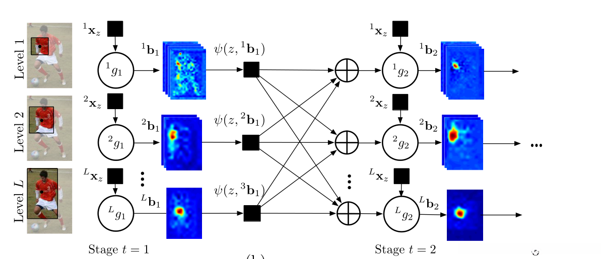 staget: 分类器的输入不仅包含x特征这一部分信息,还包括各关键区域对应的关键点信心值,这些向量均由上一层节点生成并经充分训练优化获得